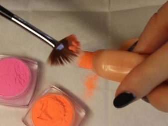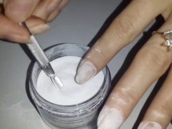 Una solució igualment popular per aconseguir un efecte mat és l’ús de pols acrílic especial. No té el seu propi color, però dóna l’efecte de la vellutor al recobriment acabat. Apliqueu la composició a la part superior sense processar amb un raspall de ventilador. L’excés de pols s’elimina després de la polimerització sense deixar residu. En aquest cas, el resultat obtingut fins i tot a casa serà molt impressionant.