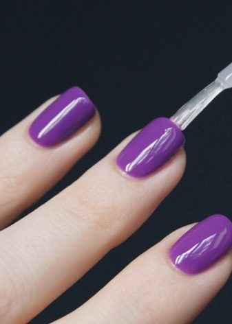- Dibuix d'una part superior mat. Es distribueix uniformement per la superfície de l’ungla, assecada sota una làmpada. Per afegir una mica de lúdic a la decoració, ajuden a dibuixar una línia brillant amb un acabat de tipus regular.