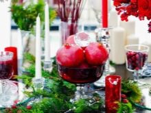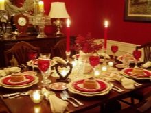 Per tradició, les taules estan decorades amb gerros amb roses vermelles, però també podeu triar composicions d'altres colors. Les fotos familiars, els atributs del casament, les boles i les garlandes de flors s’adapten perfectament per a la decoració de parets.
