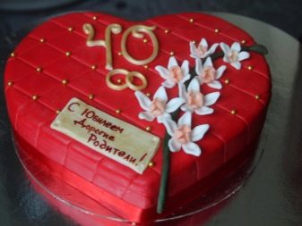 El pastís del quarantè aniversari hauria de ser especial i adequat al tema de les festes. Avui, entre els mestres de pastisseria, podeu demanar un gust de gairebé qualsevol disseny i també triar el seu gust al vostre gust. Normalment, per a una celebració així, es prepara un pastís de galetes amb un o dos nivells, recobert de màstil vermell i decorat amb flors blanques de crema o massapà.