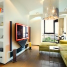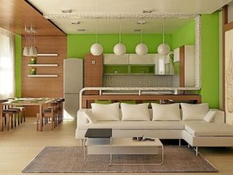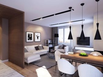 Els dissenyadors presten molta atenció a aquest mètode de zonificació. La zona de treball, il·luminada per una làmpada estàndard o una làmpada de taula, quedarà separat. A més, una bella làmpada de sostre situada damunt de la taula del menjador la distingirà de l’espai comú.