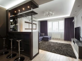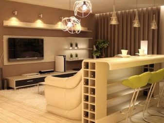 Ja ho hem esmentat anteriorment. Però aquesta no és l’única opció. Si teniu una cuina-menjador, aleshores és la barra que pot separar la zona de cuina de la sala principal. Només cal entendre això No seran suficients 20 places per adaptar-se còmodament a la cuina, a la zona de relaxació i al menjador per a una família nombrosa. Si considerem això com a part d’un apartament per a una o dues persones, aquesta opció és possible.