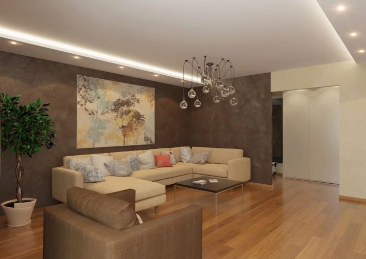 L’abundància de colors foscos a la sala d’estar de 20 metres no és desitjable. Però poden demostrar-se perfectament com a colors complementaris. Per exemple, els mobles o tèxtils de fusta fosca només l’emfatitzaran i el faran expressiu.
