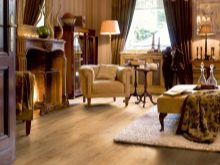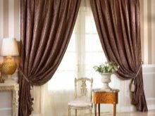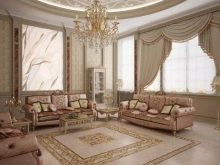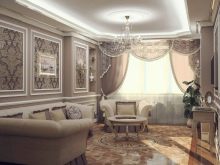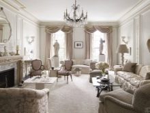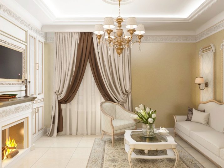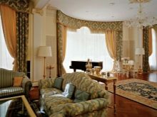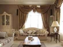 Per a la sala d’estar de l’interior clàssic, les cortines esdevenen un element indispensable. Els teixits han de ser cars: es recomana utilitzar seda, setí, organza, vellut, jacquard. La millor opció són les cortines drapades. Els volants i les llançadores no són benvinguts, però el lambrequin serà una molt bona idea.