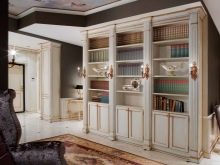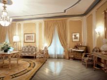 - Saló de la mostra antiga. Aquí podeu veure la llar de foc, i sobre ella - una figureta delicada de to. El sostre està cobert amb pintura elegant i senzilla, els armaris són simètrics, que els canons d’estil els requereix.