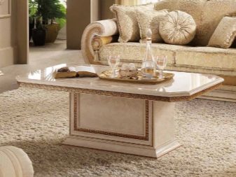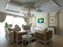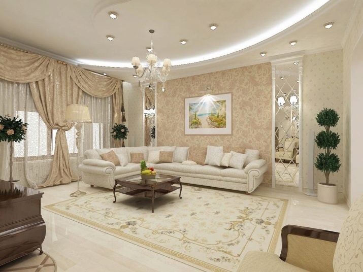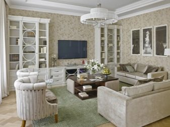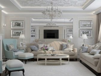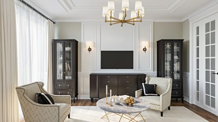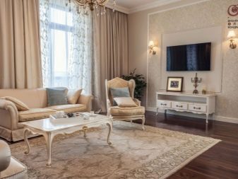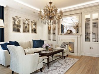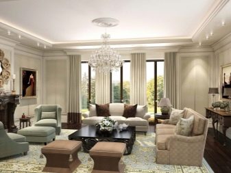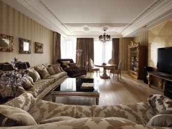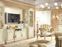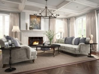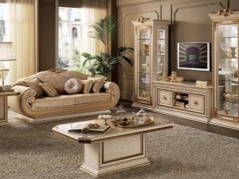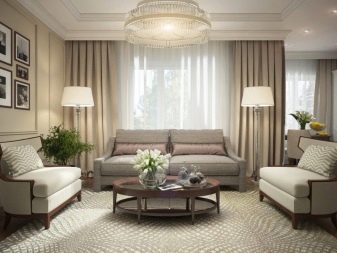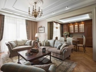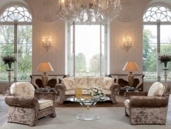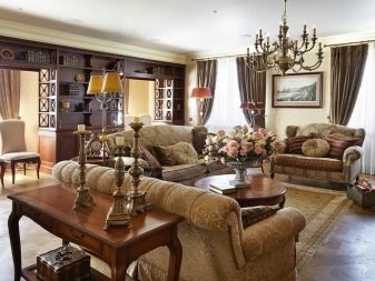 Pel que fa als mobles, pot ser força massiu, però alhora lleuger. Per a les sales d'estar clàssiques, heu de triar mobles de fusta natural, però el material per a la tapisseria serà el setí, la seda, el cuir, el jacquard. Tapissats amb aquests teixits poden ser sofàs, otomans, cadires, cadires. Als sofàs hi ha coixins decoratius que s’ajusten a la resta de l’esquema de colors.