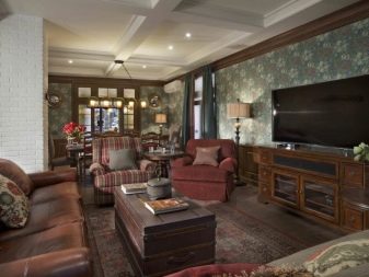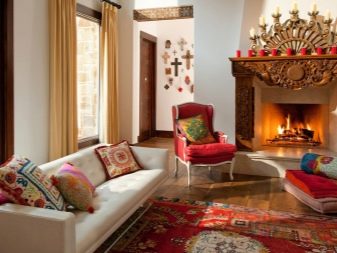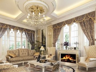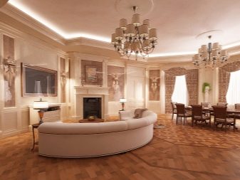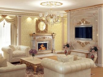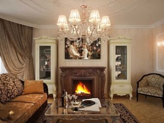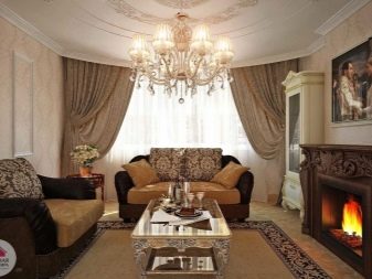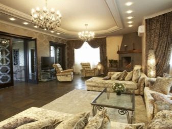 Les àmplies sales d'estar sempre són meravelloses, perquè hi ha on "passejar". A més d'una varietat de mobles, en una sala d'estar sempre hi ha un lloc per a una xemeneia real o artificial.