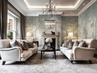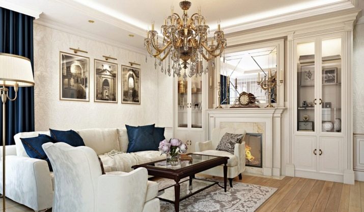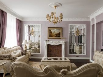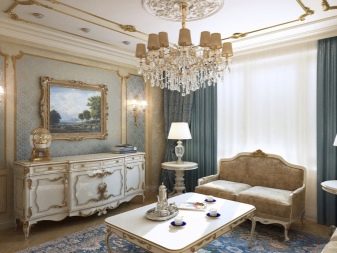 La il·luminació és un dels punts més destacats del saló clàssic. Per donar vida al disseny adequat, heu de triar canelobres de gran qualitat, ja que són un model insubstituïble. Les canelobres han de ser pesades, cristal·lines, elegants. És millor triar accessoris entre metall, només no hi hauria d’haver patrons.