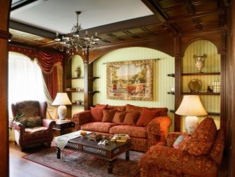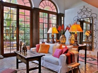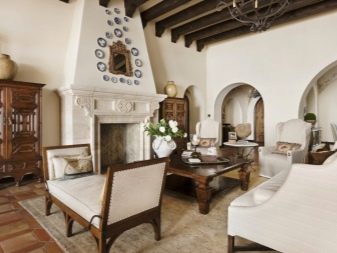 - Estil espanyol molt saturat, sud, calorós. El centre d'aquest saló serà un sofà de tons "cars": blanc de neu, gris clar, beix. A més, necessitareu una taula general de fusta. No menys importants seran algunes cadires, grans gerros, miralls de llargària.