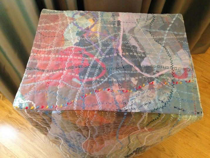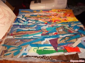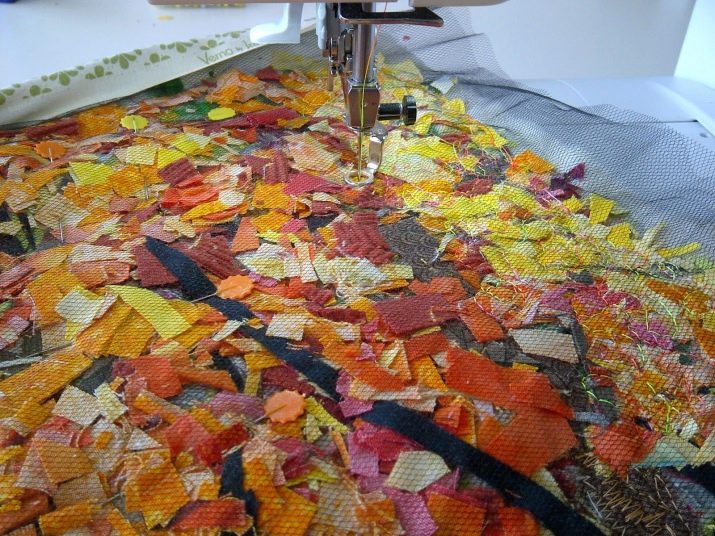 - Si voleu fer diverses capes més, el procediment serà el mateix: aplicar la pols i arreglar els fragments de teixit. Pot semblar estrany, però després de totes les manipulacions, la meitat de la feina ja estarà feta. Només heu de cobrir la peça amb organza o malla, fixar-la amb passadors de seguretat al material per evitar distorsions i cosir una màquina d’escriure.
