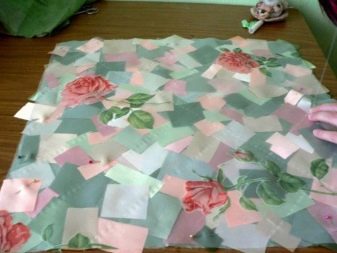 - Les taques lliures resultants estan cobertes amb petites fitxes de solapes petites. En aquesta fase, podeu afegir una mica de creativitat: els patrons pre-retallats es presenten de manera remota per tal de crear un plafó elegant.