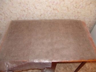 - La base de cotó es troba sobre una superfície de fusta o plàstic. Es distribueix uniformement un hivernès sintètic i es cobreix amb una altra capa de teixit de cotó. Per cert, fins i tot es poden fer servir tovalloles de cuina antigues com a base, mentre que el patró no té absolutament cap valor.