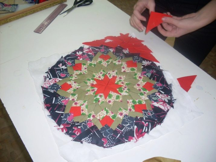 - Si heu pres el punt de cola com a base, podeu començar immediatament a enganxar les solapes. Si no és així, aleshores, per a la primera capa, és recomanable ruixar la base amb pols de cola per tal de fer-la el més còmoda possible i només després condimentar la “pizza” amb els rascats de tela preparats. Les tonalitats sucoses i saturades semblen molt elegants, donen un contrast espectacular, és per això que les dones artesanes experimentades solen començar a treballar amb la formació d’una capa de solapes de vermell, verd i marró.