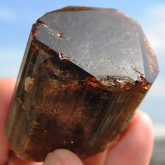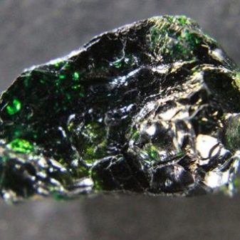 - Una de les varietats més interessants i inusuals de turmalina és la camaleonita. Aquesta pedra té una aparença ineficaç, una tonalitat pantanosa, però si cau a l'ombra canvia de color fins a marró vermell. Fixeu-vos en la diferència de matisos del mineral dia i nit, i entendreu per què porta un nom tan "parlant".