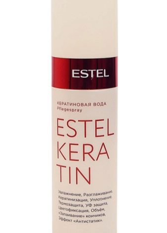 L’aigua de la queratina d’Estel es produeix com un esprai en envasos de 100 ml. Actua com a fixador a l’etapa final del procediment de restauració del cabell. Proporciona hidratació instantània, densificació, suavització, segellat de les puntes i, a més, conserva el color de les filades de colors. A més, l’eina és una excel·lent protecció antiestàtica i tèrmica. Els rínxols després del procediment del tractament no estan exposats als efectes nocius dels raigs UV i altres irritants externs. Després de l’aplicació, no cal rentar l’aigua de queratina. El preu és de 400 rubles.