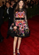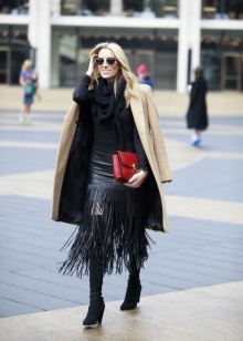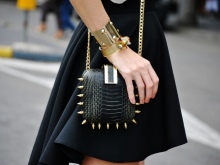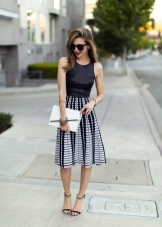 Un petit vestit negre amb una falda completa i una cartera d’embragatge en miniatura que sembla elegant. L’arc total negre es dilueix amb la brillantor metàl·lica de les bosses i polseres. A la festa, exactament totes les mirades es dirigiran al fashionista en un vestit així.