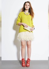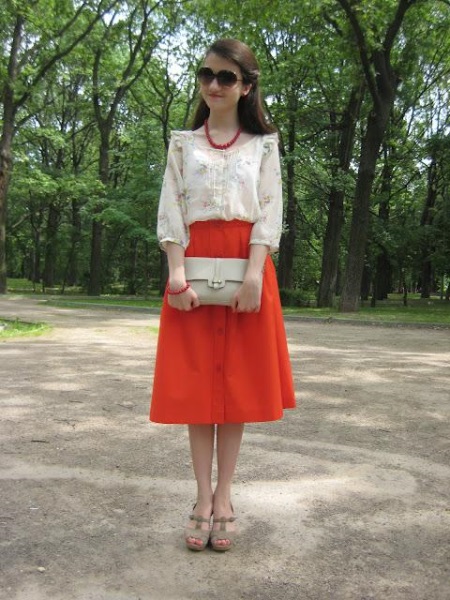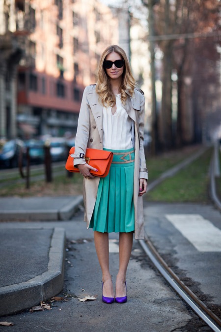 Mirat clar i vistós a la primavera. Al centre hi ha una combinació de tres colors i elements: sabates blaves, una falda turquesa i un embragatge taronja. A primera vista, són mútuament excloents, però, fusionant-se en un sol llaç, transformen la imatge, respirant-hi una nova vida.