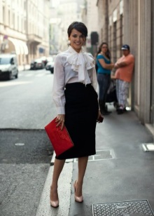 - Els estilitzats vestits d’oficina en colors neutres (negre, gris, blau) els estilistes recomanen diluir amb un clutch concis brillant. Es permet un petit acabat en forma de reblons i cinturons.