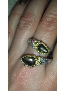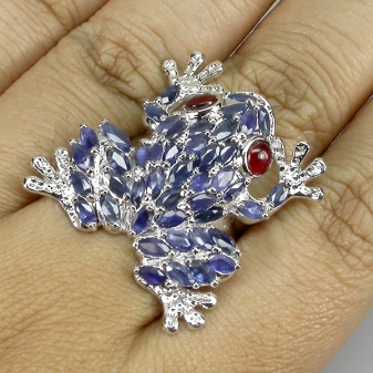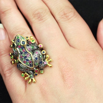 L’anell en forma de granota arrebossat amb safirs i rubins sembla interessant i inusual. Una combinació de colors contrastada permet que el petit anell es vegi molt brillant i elegant. Per regla general, aquest producte no serà petit, de manera que no el podeu portar cada dia.