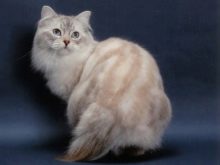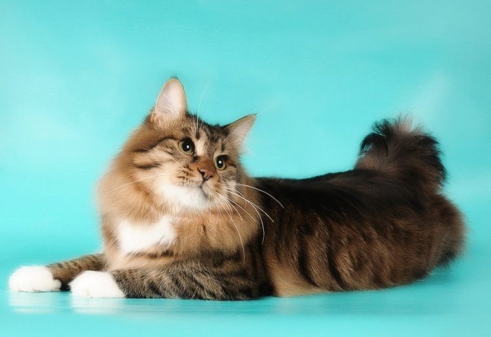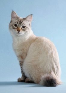 - Es distingeix per una cua d’una forma especial - amb una borla en forma de ventall, es forma al final. Es permeten els greixos. Amb excitació nerviosa, el gat aixeca la cua cap amunt, en estat de repòs baixa, pressionat cap al cos. La durada del procés caudal no ha de ser inferior a 2,5 cm ni ampliar-se més enllà de l’articulació del moc.