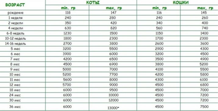 L’alçada de la noia a l’aigua se situa generalment de 28 a 30 cm, el mascle de 29 a 33 cm. La pubertat de la raça es produeix als 7-8 mesos. El pes mitjà dels animals durant aquest període és de 3,5 a 4 kg en un gat i de 4 a 5 kg en un gat.
