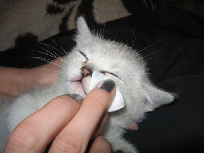 Si el gatet té supuració a la zona dels ulls, el procediment es realitza amb més freqüència. Durant el dia, processen els ulls de dues a tres vegades amb aigua plana o una solució feble de camamilla. En una solució (en aigua) es humiteja una llana de cotó o un teixit tou, i després s’aplica sobre una zona inflamada. Si la inflamació persisteix durant una setmana, poseu-vos en contacte amb el vostre veterinari.