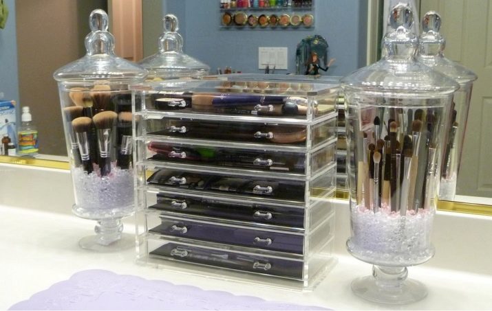 - Podeu anar endavant i comprar caixes transparents especials de plàstic. Aquests productes estan actualment de moda i és convenient emmagatzemar articles petits com ara brillant de llavis i gerres escasses amb ombres.