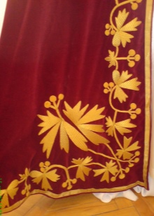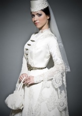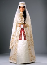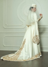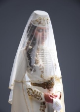 El vestit té el mateix tall que de costum i consta dels mateixos elements. La funció només és l'esquema de colors – Vestit de núvia femení de material dens de color blanc de neu, decorat amb brodats daurats.