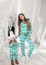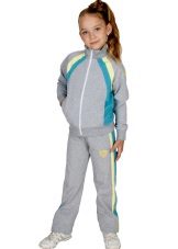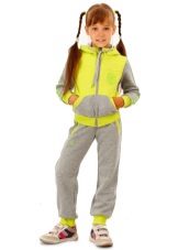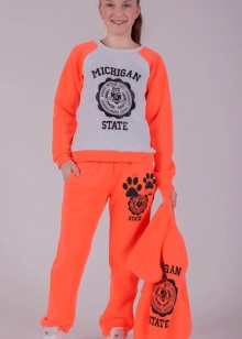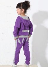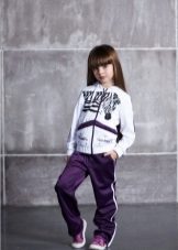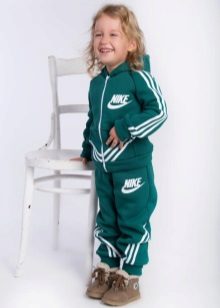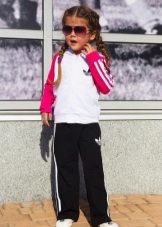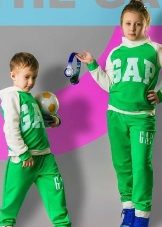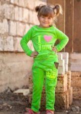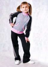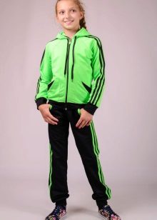 Els vestits esportius infantils combinen un lampàs combinat amb una part superior de color verd clar, un fons negre i amb ratlles de color verd clar que agradarà a una adolescent. Amb aquestes peces de roba és convenient anar a classes de la secció, podeu anar a passejar, a peu d’excursió.