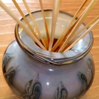 El sabor ja està a punt. Poseu-lo a l’habitació i poseu uns pals de fusta a l’ampolla. Haurien de pujar per sobre del coll. Al cap de 3 hores, cal que els galls s’inverteixin i començaran a emetre una olor agradable. Després que la fragància comenci a debilitar-se, torneu-los de nou. La intensitat de l’olor depèn del nombre de pals: com més siguin, més forta i brillant és l’aroma.