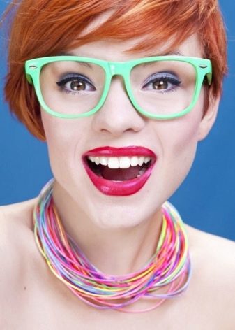 - Durant la selecció, cal tenir en compte el color del marc i el color del pèl. Les nenes amb cabells rossos no poden preocupar-se realment, ja que els accessoris en qualsevol esquema de colors són adequats per a ells. Però els cabells vermells s’han de limitar a matisos suculents de morat, verd clar o blau.