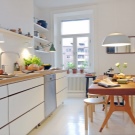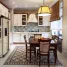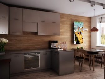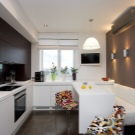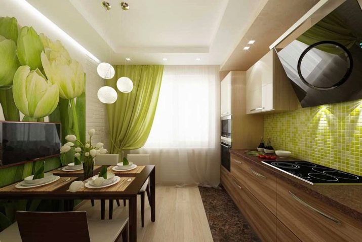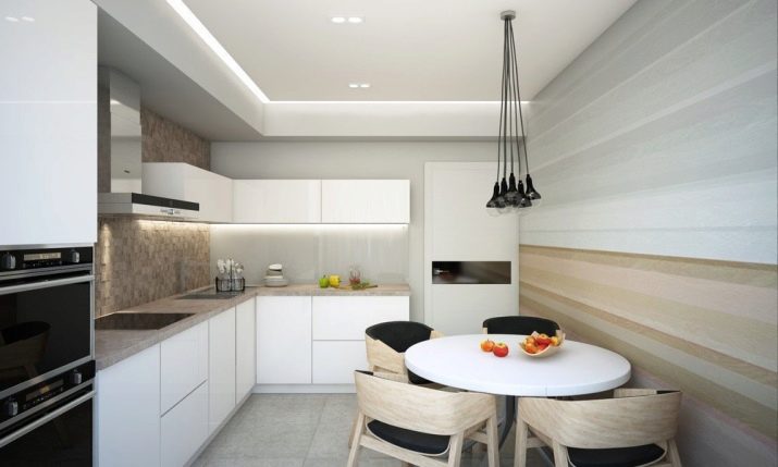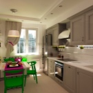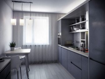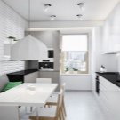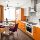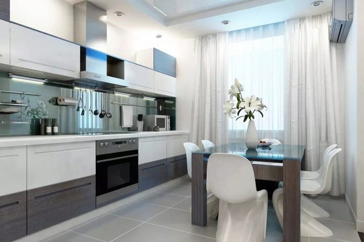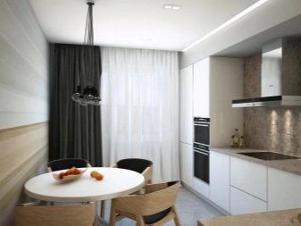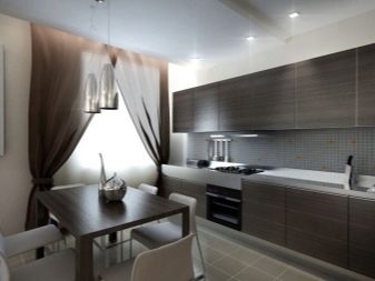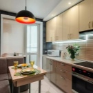 Normalment es col·loca una taula en una petita cuina al llarg d’una de les parets per crear un passadís ampli convenient. Si teniu una cuina-menjador amb sofà, també heu de pensar en una zonificació competent de la sala: es pot fer amb l'ajuda de mobles o diverses opcions de decoració.