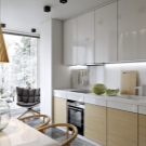 Una petita cuina lluminosa d’estil escandinau té un aspecte excel·lent: el disseny de les façanes dels auriculars és molt inusual i dóna a l’espai una estètica especial. La fusta natural a l’interior us permetrà sentir-vos com una part de la natura.