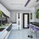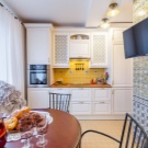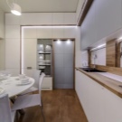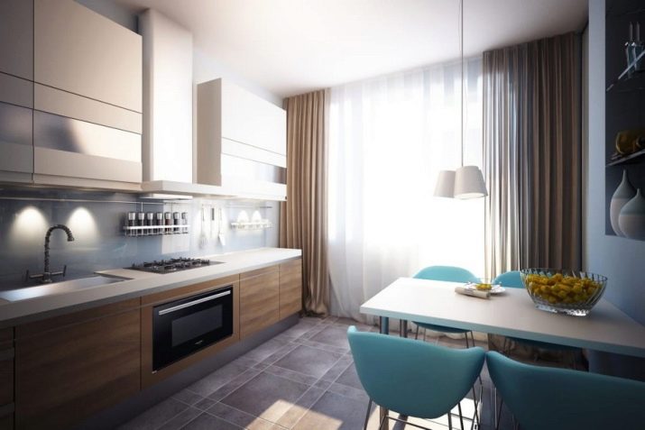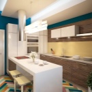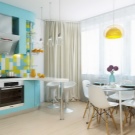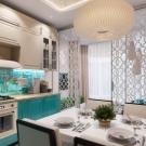 La petita cuina té un aspecte fresc i acollidor gràcies als seus colors clars i interessants accents turquesa. Un interior tan modern no només serà molt bonic, sinó que també serà molt funcional: la disposició còmoda del taulell de bar amb un cantó inclinat, armaris alts i laconicisme faran que l’ambient sigui còmode.