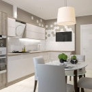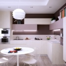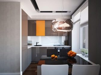 Al mateix temps, no us oblideu de l’estètica. És especialment difícil triar un audiòfon per a una cuina petita.Per fer que l'espai sigui percebut visualment més ampli, cal que sigui el més integral possible. El millor de tot és que si els auriculars constaran d’armaris tancats amb electrodomèstics integrats i sense nanses. Els materials brillants també tenen un bon aspecte, reflecteixen la llum i fan que la sala sigui àmpliament visual. Pel que fa a les cuines grans, podeu triar façanes multicolors per a auriculars i prestatges oberts.