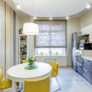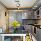 Una petita cuina cantonera és adequada per a aquells que rarament cuinen a casa. Els auriculars ocupen un mínim d’espai, alliberant espai per a la taula. Una cuina de mida petita, fins i tot pot substituir la sala d’estar. De color groc brillant en combinació amb el gris, sembla agradable i amenitza l'interior.