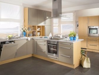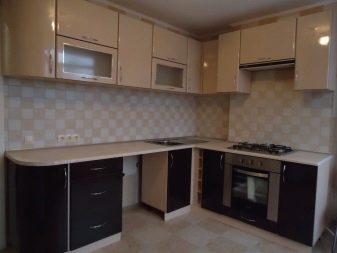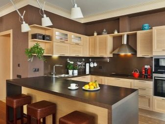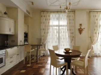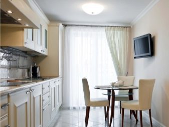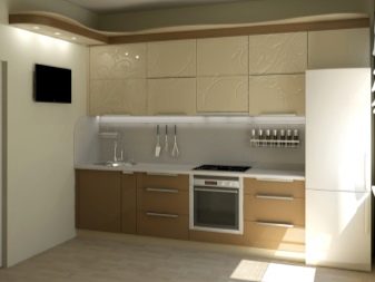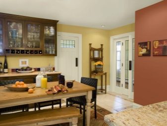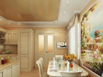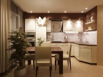- L'elecció dels colors per al conjunt de cuina de l'habitació, realitzat en colors vius, implica diverses opcions. Les parets i el sostre de color vainilla van bé amb colors profunds (xampany, xocolata, magrana vermella). El sòl beix està en sintonia amb els mobles làctics.