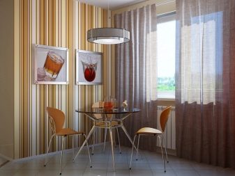 - Tots els tons de beix són perfectes per a la decoració de parets. Especialment aquesta solució és rellevant per a habitacions compactes. Per a la cuina en miniatura, s’escullen fons de pantalla de color xampany amb un patró petit o intercalats. Una altra solució elegant serà decorar les parets amb ratlles brillants. D'altra banda, la crema es combina sovint amb el blau, el rosat o el morat. Un patró vertical farà que els sostres de la cuina visualin més alts.