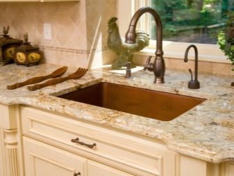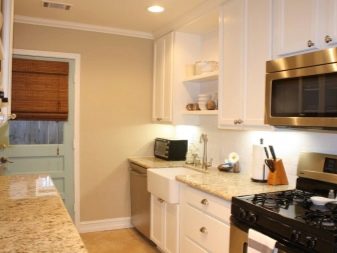 - Cuina en miniatura feta en colors pastel, implica la presència d’una pica de granit. Per a una completa harmonia, podeu triar un taulell per combinar el to o decorar el sòl en aquesta línia. Pel que fa al lavabo de metall, gairebé no és adequat per a una cuina de color xampany.