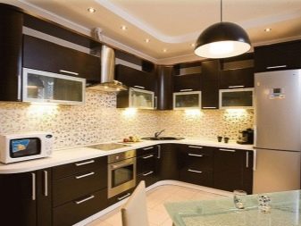 - Sostre de crema i canelobre perfectament en harmonia amb mobles de color marró fosc i electrodomèstics negres. També es permet una combinació de taulells foscos i sostre beix.