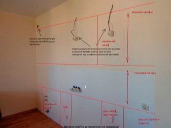 Hi ha algunes regles que s’han de seguir durant la instal·lació. Per exemple, els endolls dissenyats per a electrodomèstics petits haurien d’estar a 1,1-1,4 metres del terra.Si es proporciona il·luminació, les fonts d’alimentació corresponents es troben a 20 centímetres del taulell. Les fundes per a caputxes es troben a 50-60 centímetres dels armaris.