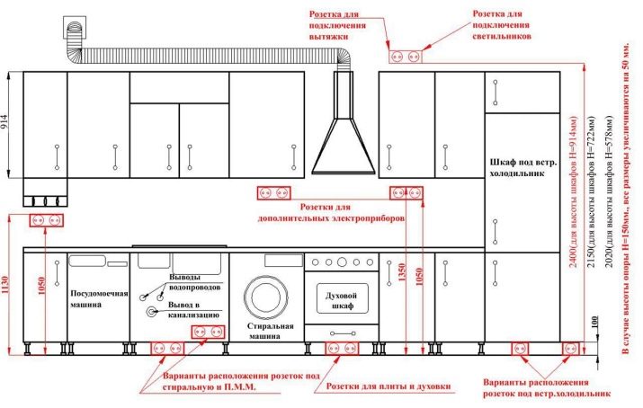 Està prohibit col·locar punts d’alimentació a les immediacions d’una estufa o lavabo de cuina. Els models han de ser impermeables. A més, no s’ha de tenir en compte la mida del plint a la superfície de treball. Podeu equivocar-vos a la secció de cablejat.