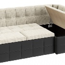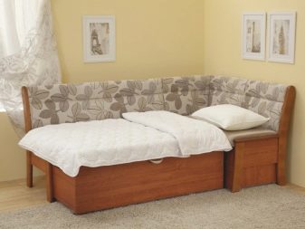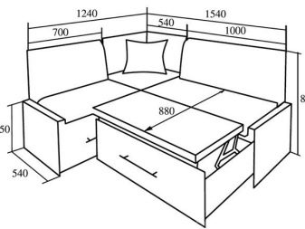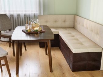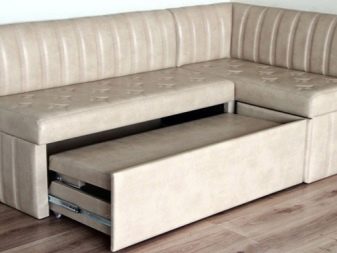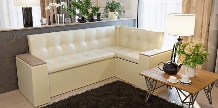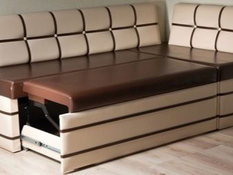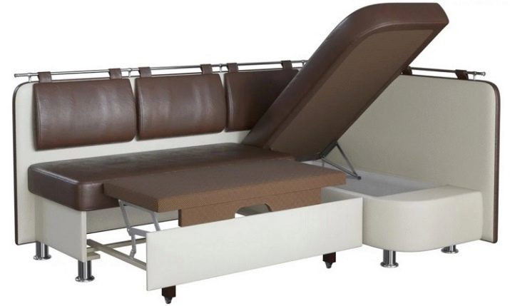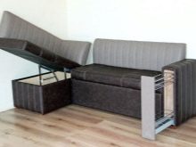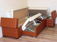 El producte també s’ha de situar el més lluny possible de l’aigüera de manera que les esquitxades del rentat dels plats bruts no caiguin a la tapisseria. Molt sovint els models de cantonada estan equipats amb compartiments amplis per guardar-hi la roba de llit, estris de cuina i petits electrodomèstics. És molt convenient quan és impossible col·locar armaris de paret i instal·lar una funda a llapis, et permet posar un gran nombre de coses necessàries a la cuina en un sofà.