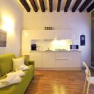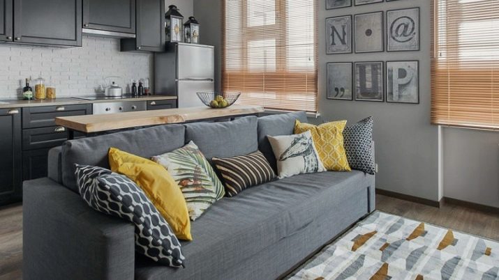 A les cuines espaioses, amb l'ajuda d'un sofà, fan la zonificació de l'habitació, separant les zones de treball i de menjador.