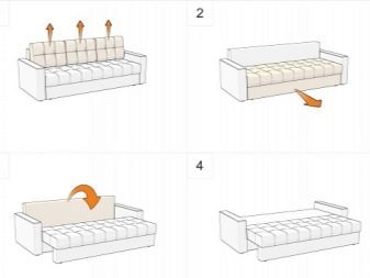 A la part de darrere i dels seients es forma un espai per dormir en sofàs d’aquest tipus, segons el principi d’un llibre obert, formant un llit espaiós. Aquests models no necessiten un gran espai al davant i són la millor opció per a cuines estretes. El propi mecanisme de plegament és força senzill i fiable, cosa que permet utilitzar el sofà com a lloc permanent per dormir.