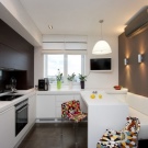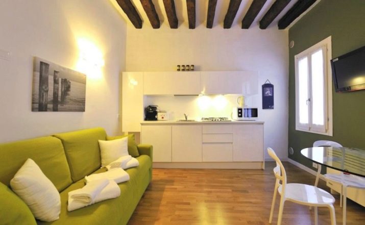 Una cuina espaiosa amb un disseny original conté un conjunt de cuina, una taula de menjador amb cadires i un sofà estret amb forma directa i llit. La paret blanca pintada a l'esquerra es combina amb mobles de cuina de color llet. La paret dreta de color verd es complementa amb mobles entapissats de to herbós. Coixins blancs i un plaid donen una comoditat interior.