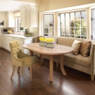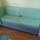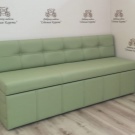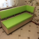 - Imitació de cuir. Un bonic disseny, una àmplia selecció de paletes de colors, la facilitat de neteja i la durabilitat són tots els avantatges dels sofàs de cuina d’aquest material. L’inconvenient és la possibilitat de deformar-se amb canvis freqüents del nivell de temperatura i humitat.