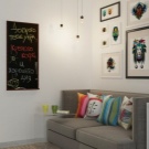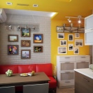 L'habitació té un estil clàssic en tons suaus de color beix. La unitat de cuina, les parets i el taulell de bar amb cadires lletoses amplien visualment la sala estreta. Un sofà directe amb una clara fruita de mostassa proporciona a l'espai un contrast i un aspecte més interessant. L’interior es completa amb un davantal pintat, plaques a la paret i cortines d’olivera enrotllades.