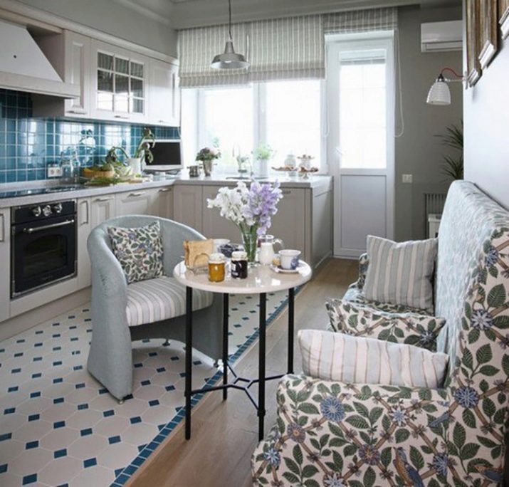 La cuina d'estil de provença té una aparença molt suau i bonica. Una suite clàssica lluminosa amb un taulell gris i davantal de color blau. Les persianes, una senzilla làmpada i una petita taula al centre de l’habitació no carreguen l’interior i miren el lloc. Les zones de treball i de menjador estan delimitades amb diferents revestiments de sòl. La cuina està coberta amb rajoles de color blau gris i la sala d’estar està laminada. El disseny es completa amb un sofà plegable estret de forma directa i una còmoda butaca grisa.