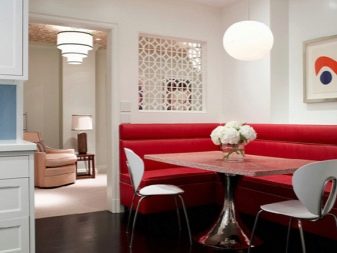El color vermell dels coixins del sofà i la tapisseria es combina amb èxit amb la superfície fosca del taulell. Per suavitzar l’agressivitat dels tons vermells, es pot afegir entrecreuats amb colors grisos. La combinació d’un seient i cadires de sofà vermell, l’esquena grisa i una taula de vidre transparent feta d’una taula petita sobre potes metàl·liques té un bon aspecte.